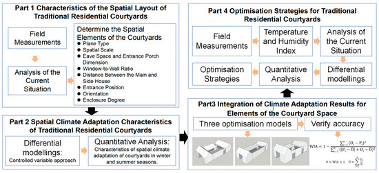 Traditional residential courtyards’ climate adaptability as a conventional architectural form is primarily evident in their design, material selection, and layout [8], which effectively alleviates the effects of external climate variations [9]. These compounds exhibit characteristics of adjustability [10,11], operability [12], and implementability [13,14].