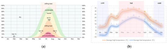 (a) Hyoi humidity comfort level chart; (b) Average temperature trend 2019–2021.