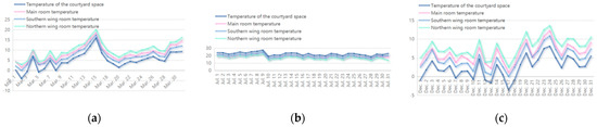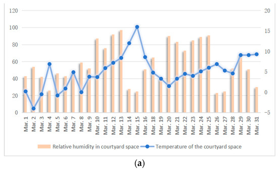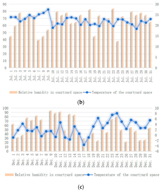(a) Courtyard space heat and humidity environment in March; (b) Courtyard space heat and humidity environment in July; (c) Courtyard space heat and humidity environment in December.