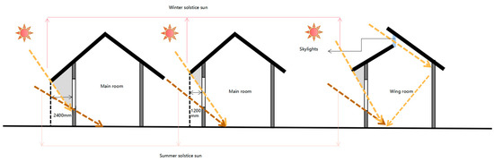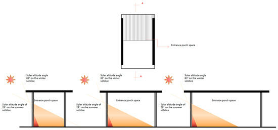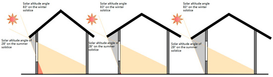 The eave space is a transitional area between the structure and the external environment, significantly influencing indoor climate regulation. In Xiaoyi Ancient City, the sun altitude angle measures 28° during the summer solstice and 83° during the winter solstice. Expanding the eave space can effectively obstruct solar radiation and lower indoor temperatures during the summer solstice; however, during the winter solstice, a vast eave space may compromise indoor lighting, leading to inadequate illumination (Figure 4). Consequently, an appropriate width of eaves space can efficiently modulate internal lighting conditions, considering the equilibrium between shading and illumination.