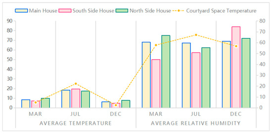The verification item comprises the climate data for the No. 4 home in the Bridge North section of Xiaoyi Ancient City (Figure 2). Meteorological data are extracted from the software, and daily temperature and humidity for March, July, and December in Xiaoyi Ancient City are analyzed (Figure 3). The measured data are incorporated into the formula alongside the software’s meteorological data for computation. The verification process revealed the software’s accuracy is satisfactory, with a WIA of 0.97, demonstrating that ECOTECT is suitable for simulating climate comfort.