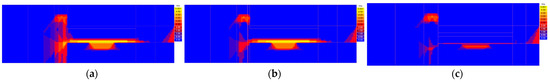 (a) Winter Sunlight in the 1200 mm Eaves Space of the Main House; (b) Winter Sunlight in the 2000 mm Eaves Space of the Main House; (c) Winter Sunlight in the 2400 mm Eaves Space of the Main House.