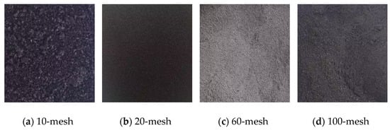 Ordinary Portland cement, P.O 42.5, is used in the experiment. The rubbers used in this experiment to prepare the specimens are recycled from the waste tires. The whole tire was first crushed into 10-mesh (2 mm) rubber particles, and then ground into 20-mesh (0.85 mm), 60-mesh (0.25 mm) and 100-mesh (0.15 mm) rubber powders, respectively, as shown in Figure 1. This measure is adopted to investigate the influence of the rubber particles size on the strength of PFRFC. The rubber particle size range was selected based on the following consideration: 10–100-mesh is a common range for the industrial grinding of tires, covering typical products from coarse particles to fine powders, which is in line with the actual recycling process. Studies [30,44] found that 20–60-mesh particles are widely used for modifying concrete to balance the interfacial effect with mechanical properties. Fiber is a type of material, composed mainly of continuous or discontinuous filaments. Polypropylene fibers with a length of around 6 mm are used in the experiment. The main technical parameters for cement, rubber, and fiber are shown in Table 1. The preparation of foam involves the dilution of the foam agent and water in a 1:40 ratio to obtain the diluted liquid. Then, the diluted liquid is converted into stable foam using a foaming machine. Finally, the foam with a density of 50 kg/m3 is acquired.