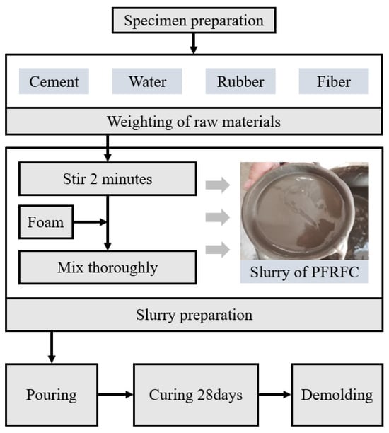 The process of specimen preparation is presented in Figure 2. First, molds with different shapes are prepared according to different test types. In order to ensure the integrity of the specimen, molds should be coated with engine oil. Secondly, the foam agent and water are diluted at the volumetric ratio of 1:40, and only those foams with a density error of less than 5% (665–735 kg/m3) can be used. Next, it is necessary to mix the cement, water, rubber, and fiber together to obtain the basic paste. Then, the foamed concrete slurry is produced by adding preformed foam to a basic paste. Once the slurry has been obtained, it is necessary to determine its flow value. Only slurries with a flow value between 160 mm and 190 mm can be poured into the molds. The molds poured with the slurries are attached with cling wraps and put into the standard curing room for 7 days; the curing temperature is 20 ± 2 °C and relative humidity is more than 95%. Then, the demolding process is conducted. Finally, the specimens are weighed and put into the sealed bags in the standard curing room until 28 days from the start of the experiment.
