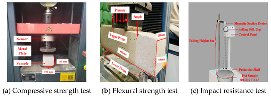 The static and dynamic strength tests include compressive strength tests, flexural strength tests, and impact resistance tests, as shown in Figure 3.