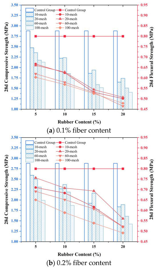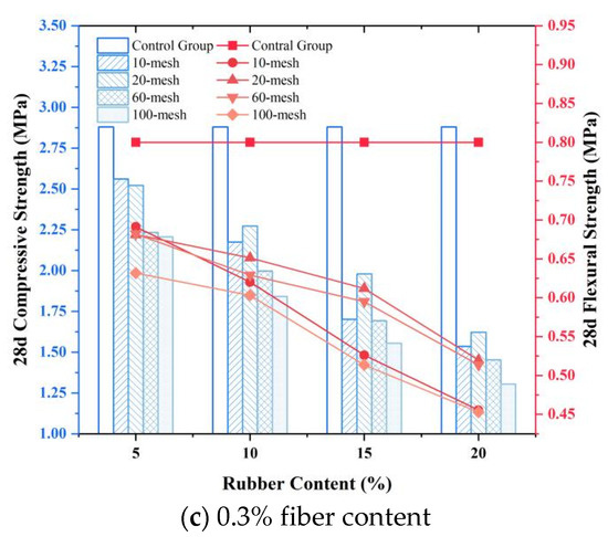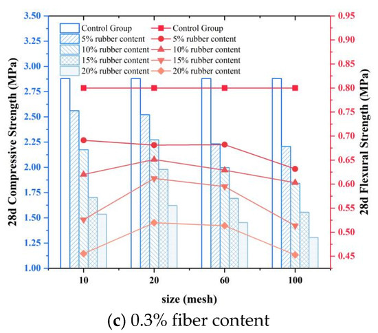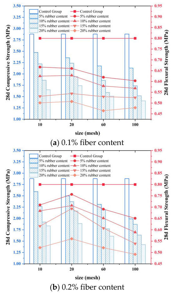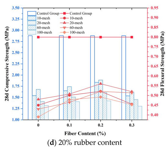 The variations in compressive and flexural strength as a function of rubber particle size are illustrated in Figure 6. The subplots in Figure 6 show that, in most cases, the compressive and flexural strength firstly increase to the peak values and then decrease with the increasing rubber particle size. The peak strength occurs with the 20-mesh rubber particle size. The strength descends in order 20-mesh > 10-mesh > 60-mesh > 100-mesh for most experiments. However, some special cases, as seen in Figure 6a, for example, do not present the peak values. It is most likely that the experimental discreteness or the range of rubber particle size (100- to 10-mesh) did not allow the sample with 5% rubber content to reach peak strength. More evidence for the optimal rubber size 20-mesh is found in Ma et al. [43], whose experiments also proved that the rubber particle size has an optimal value.