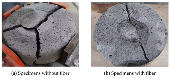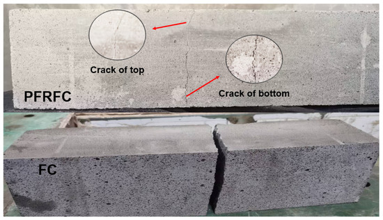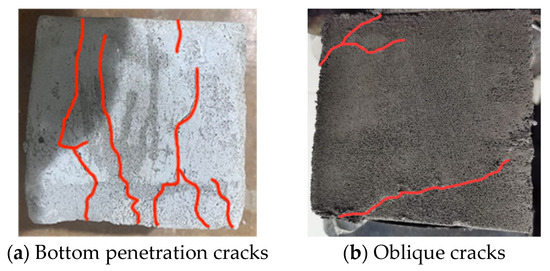 Under the action of pressure, the top surface of the specimen shows a concave trend and thus the bottom is stretched, as shown in Figure 5a. Because of the low tensile strength of PFRFC, cracks mostly appear from the bottom and develop through the whole specimen. At the same time, the rubber inside the specimen can produce large deformation to absorb the upper load and thus yield shear failure of the cement matrix on both sides of the rubber, resulting in oblique cracks, as shown in Figure 5b. The deformation of the rubber is greater than the deformation of the cementitious matrix in the FC. Due to the inconsistency of the deformations, the contact position between the rubber and the cementitious matrix in the specimen is prone to turn into a fracture [54].
