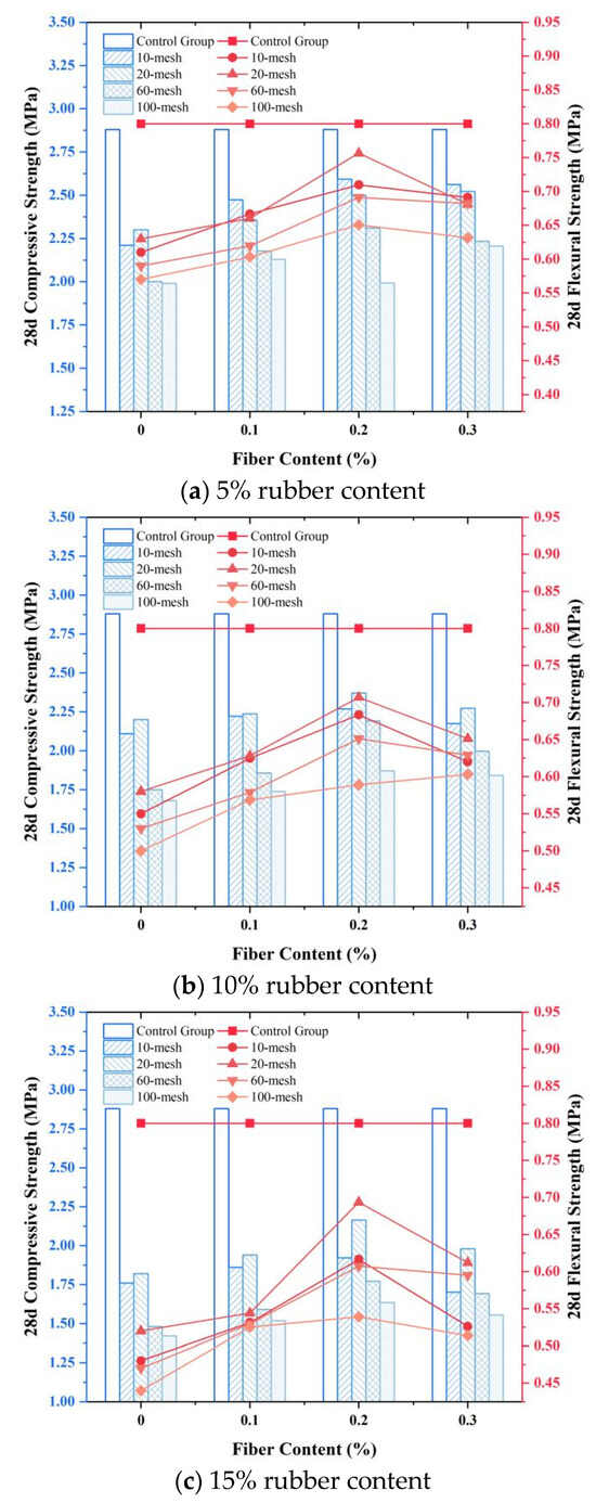- With the increase in the rubber particle size, the compressive strength, flexural strength, and impact resistance of PFRFC show parabolic trends. Fibers can fill the undesirable pores of large rubber particles to mitigate the strength decrease caused by large particle size. Overall, the optimal indicators are obtained with 20-mesh rubber particles.