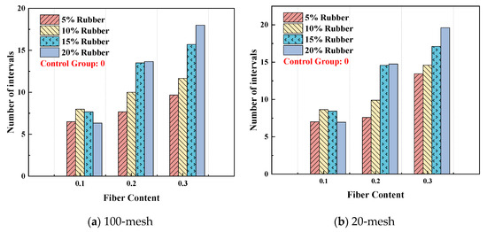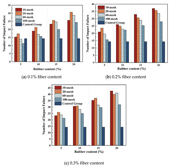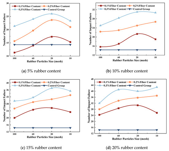 Figure 10 presents the impact resistance of the specimen under different rubber particle sizes. In general cases, PFRFC with 20-mesh rubber particle size achieves the best impact resistance, followed by 1–3 mm, 60-mesh, and 100-mesh varieties, and the maximum increase can be 1.75-fold. The unit allowable deformation capacity of 20-mesh rubber particles is stronger, and the distribution is relatively more uniform. As the rubber particle size increases, the non-uniform contact area rises further, and the frictional resistance between the cement and the rubber increases [56,57]. This results in an increase in the damping ratio of the PFRFC. However, when the particle size increases to 10-mesh, the uneven contact area between rubber particles and cementitious materials is too large. The rubber particles tend to separate from the cementitious material during impact loading, and the reduction in friction between the cement and the rubber leads to a decrease in the damping ratio of the PFRFC. Consequently, the impact resistance of the specimen is reduced.