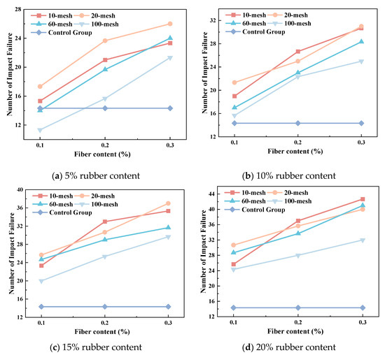 The experimental results of the impact resistance test with different rubber contents are shown in Figure 9. As can be found, the impact resistance increases linearly with the rubber content. Compared to the control FC specimens, when the rubber content increased from 5% to 20%, the number of maximum ball drops increased by 85%, 121%, 164%, and 200%, respectively. This proves that the impact resistance of FC mixed with rubber particles is obviously enhanced. Eltayeb et al. [26] also arrived at similar experimental results and attributed the improvement in impact resistance to the ability of the rubber particles to absorb impact energy due to their ductility. Moreover, when the specimens were subjected to an impact load, the relative sliding between the rubber particles and the cement matrix helped to absorb some of the energy, reducing the spread of impact energy and increasing the impact resistance of the PFRFC.