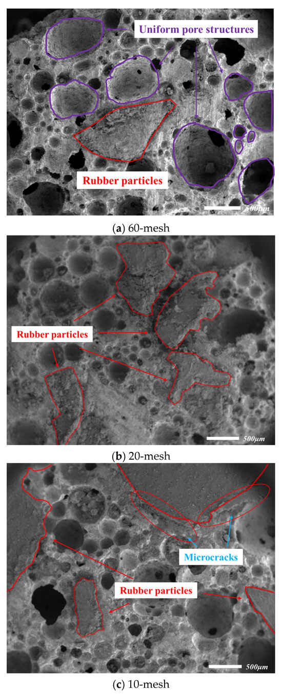 The SEM results are presented in Figure 14 and Figure 15. As illustrated in Figure 14a,b, pore structures are formed around the rubber particles, and the arrangement of these pore structures is uniform as the rubber particle size increases. As the rubber particle size increases from 60-mesh to 20-mesh, it can be postulated that the rubber particles form a backbone structure, thereby enhancing the strength of the pore structure. Consequently, the compressive and flexural strengths of the material also increase. However, when the particle size increased to 10-mesh, shown in Figure 14c, the uniformity of the pore structure diminished, and micro-cracks emerged around the larger rubber particles. This suggests that at this stage, the bonding of the cement matrix was impeded by the substantial dimensions of the rubber particles, which subsequently resulted in a decline in the compressive and flexural strengths. Furthermore, micro-cracks at the bond interface between rubber and cement are evident in Figure 14c. The presence of micro-cracks resulted in a reduction in the static strength of the material. Conversely, an increase in rubber content resulted in an enhancement of the dynamic strength of PFRFC due to its capacity to absorb energy.