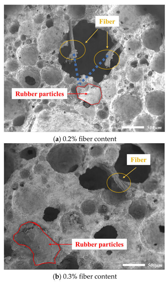 However, when the fiber content continues to increase, it becomes difficult to uniformly disperse fibers during specimen preparation, and aggregated fibers may cause stress concentrations when the specimen is subjected to stress. A study by Ren et al. [55] revealed that the agglomeration of fibers resulting from poor dispersion can lead to a weakening of the bond between the fibers and the hydration products. This caused a decrease in the compressive strength of PFRFC with 0.3% fiber content in Figure 7, indicating that excessively high fiber content will weaken the strength mitigation mechanism of polypropylene fibers in terms of rubber. Therefore, the fiber content should be controlled at around 0.2%.