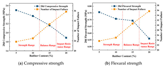 After investigating the effect of rubber content, rubber particle size, and fiber content, this section aims to recommend an optimal mix design to provide references for various practical conditions. First, the rubber particle size should be 20-mesh as it corresponds to the optimal compressive and flexural strength, as well as the best impact resistance. Then, the fiber content should be 0.2% as it provides the best static strength. Continuously increasing the fiber content may reduce the workability [59] and increase the cost, although it can improve the impact resistance. Finally, the key point is the rubber content as it can decrease static strength but increase impact resistance. Under this condition, we used the “balance zone method” proposed by the authors [1] to satisfy various conditions. As shown in Figure 16, we plot the compressive or flexural strength versus the impact resistance in one figure. These strengths are divided into three ranges based on the rubber content: 5–12% for static strength, 12–17% for balance, and 17–20% for impact resistance. The classification is based on the intersection of the curves, from left to right, according to the amount of rubber content.