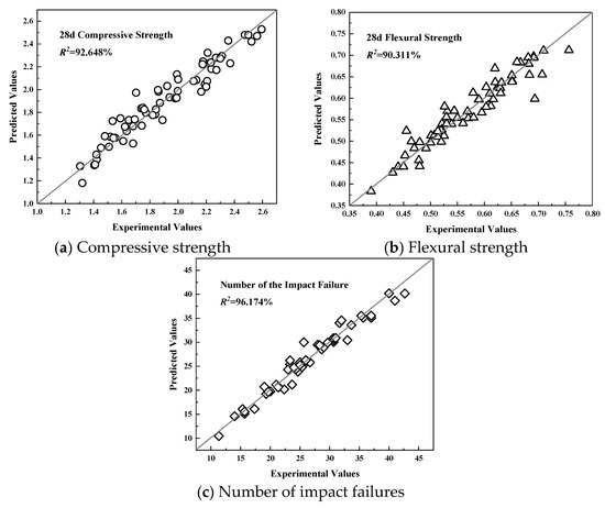 According to the experimental results, we can establish the prediction model of the compressive and flexural strength, as well as the impact resistance. The prediction equations for compressive strength, flexural strength, and impact resistance of PFRFC are established as shown in Equations (9)–(11).
