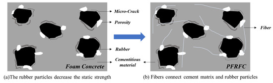 The effect of sample density has been investigated by many studies [45,46,47]. In these, the increase in density improved the strength of foamed concretes. Accordingly, the influence of density to the PFRFC is not detailed any more in this study. In this paper, a common wet density value of 700 kg/m3 is selected as a representative sample. Correspondingly, the mass of each material per admixture volume of cement slurry for different rubber and fiber contents is shown in Table 2.