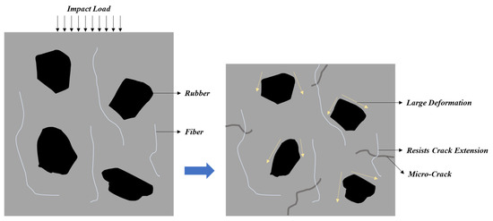 Under the impact load, the rubber particle undergoes large deformation, absorbs energy through plastic deformation, and reduces the transfer of impact energy to the matrix, and at the same time, the interface between the rubber and the matrix slides relative to each other to produce friction, consumes energy, and reduces the propagation speed of the impact stress wave, improving the damping ratio of the material. When an initial crack appears in the matrix, the fiber spans both sides of the crack and resists crack extension through its own tensile strength (>486 MPa) and interfacial friction, so that the specimen can still withstand multiple impacts after cracking. In addition, the three-dimensional distribution of fibers forms an “energy-consuming network”, which acts synergistically with the deformation energy dissipation of the rubber to prolong the damage process and increase the number of impacts, as shown in Figure 19.