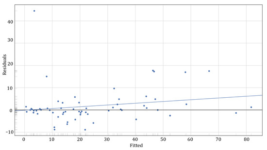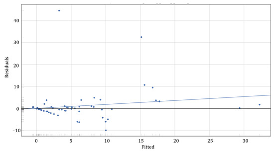 The residual graph of Figure 6, shows evidence that the residuals are moderately randomly distributed around zero throughout the range of fitted values. However, some outliers are observed, especially for higher predictions. This indicates a slight tendency towards underestimation at the upper extremes, but without obvious structural patterns that compromise the model’s validity. The slight inclination of the trend line suggests that, although the model is generally accurate, it could benefit from additional adjustment in extreme cases.