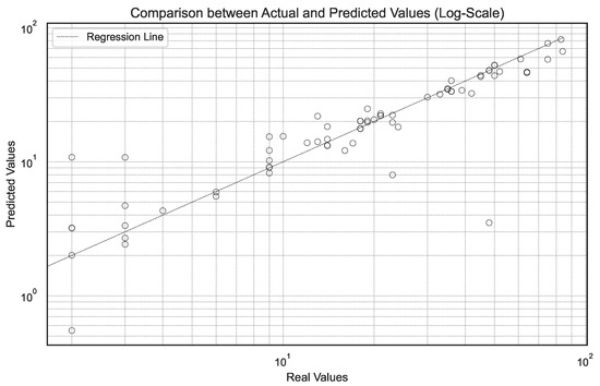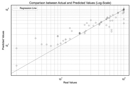 Figure 9 shows the comparison between the actual values and those estimated by the model for the case of the fan, using a logarithmic scale in both axes. The analysis reveals that the model offers higher accuracy in the medium–high range, approximately between 10 and 60 percentage of use, where most points are grouped near the regression line, reflecting a stable match between the observed and the predicted. On the other hand, for values below 10, cases with higher predictions than the actual observations are identified, indicating a tendency towards overestimation in that range. Conversely, at the upper end, above 60, some points are located below the fit line, which suggests certain underestimations. Although limited, these deviations could be related to lower data representativeness at the extremes or external variables not included in the model, such as natural air circulation, specific hours of use, or seasonal particularities. Despite these particular discrepancies, the overall relationship between the predicted and actual values remains consistent, reflecting an adequate ability of the model to capture the main dynamics of device use in real conditions.