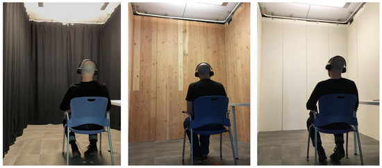 Second experiment. A researcher demonstrates the participant seating position in the climate chamber with the black curtain (left) that all participants viewed upon entering the chamber before either the wood (center) or white (right) wall conditions were revealed from behind the curtain.