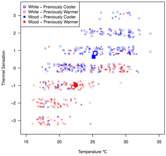 In the first experiment, air temperature in the chamber was continuously modulated and 29 participants experienced transient thermal comfort conditions, both above and below the comfort zone, and with both white and wood walls on different days. Figure 2 shows the Thermal Sensation Vote plotted by air temperature in the chamber at the time the subjective thermal comfort response was given in the white or wood-clad chamber. Additionally, it groups responses based on whether it was cooler or warmer in the chamber 15 min prior to the time the response was recorded. The type of wall treatment (white or wood) was not found to have a significant effect on perceived thermal comfort in the first experiment; however, the environmental conditions of the experiment demonstrate the impact thermal history has on current perceptions of thermal comfort.