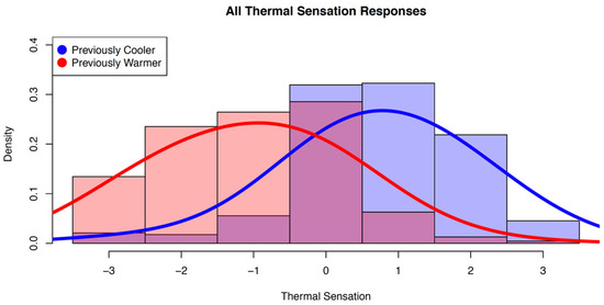 First experiment. Distribution of all participant (N = 29) thermal sensation responses with transient temperature, grouped by previous temperatures being cooler (blue) or warmer (red) 15 min prior.