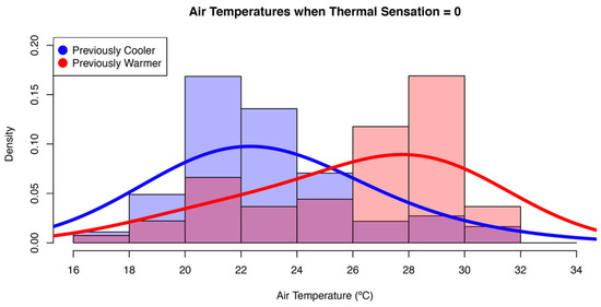First experiment. Air temperature for “neutral” (0) thermal sensation responses for all participants (N = 29) with transient temperature, grouped by previous temperatures being cooler (blue) or warmer (red) 15 min prior.