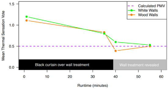 Thermal Sensation Vote response data are ordinal, and Figure 6 shows TSV responses before and after the wall treatment, revealing the percentage of each group (white or wood). The median and mode for both groups after 35 min in the chamber viewing the black curtain was “slightly warm” (TSV = +1). At the wall treatment reveal, the median and mode for the group viewing white walls remained unchanged; for the group viewing the wood walls, the median and mode changed to “neutral” (TSV = 0) with 66.7% of participants reporting this TSV after the reveal.