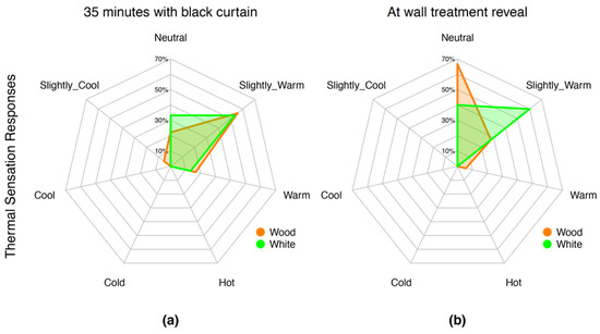 Second experiment. Thermal sensation response by percentage (white, n = 15; wood, n = 18) with steady-state thermal comfort conditions and (a) black curtain and (b) at wall treatment reveal.
