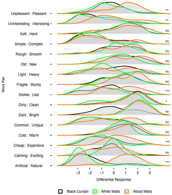 Second experiment. Semantic differential word pair responses with steady-state thermal comfort conditions with black curtain (N = 33), and at treatment reveal of white walls (n = 15) or wood walls (n = 18). p values are indicated by ns, not significant (p > 0.05); * p < 0.05; ** p < 0.01; *** p < 0.001.