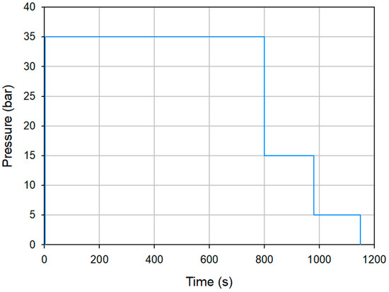 The flakes were pressed using a hydraulic press. For the boards, a pressing factor of 1.6 min/mm was applied, and a temperature of 180 °C was used for all three types of adhesives. A maximum pressure of 35 bar was applied at the beginning. After 70% of the cycle time, the pressure was reduced to 15 bar, and after 85% of the time, it was further reduced to 5 bar, as shown in Figure 1. This gradual reduction was intended to prevent sudden steam release and thus avoid board delamination. The OSB panels were stored at room temperature for 7 days immediately after pressing.