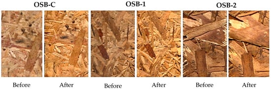 Digital images of the exposed surfaces revealed significant color changes in all tested OSB samples (Figure 2). These changes, caused by accelerated climatic exposure, are primarily attributed to the photodegradation of lignin in the wood [35], as lignin is among the first cell wall polymers to degrade under UV radiation [36]. The results presented in Table 2 indicate that the samples produced with green adhesives, OSB-1 and OSB-2, exhibited 27% and 46% lower susceptibility to color change compared to the OSB-C sample, respectively. These results are consistent with the study by Núñez-Decap et al. [14], who used the same green adhesives and obtained similar findings.