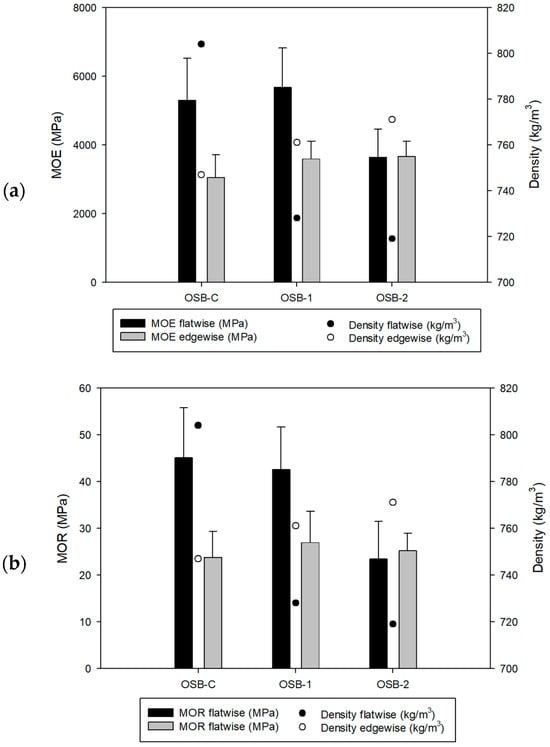 Results of bending test: (a) MOE and (b) MOR in flatwise and edgewise positions.
