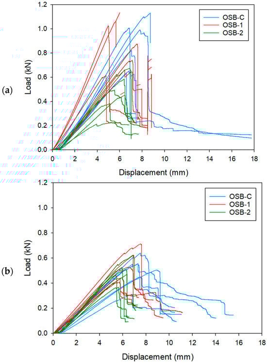 From the bending test, it was also possible to obtain load–displacement curves for the flatwise and edgewise positions of each sample (Figure 4), as well as the resulting modes of failure (Figure 5). Figure 4 shows that the OSB samples in the flatwise position exhibited stiffer performance and reached higher loads than the those in the edgewise position, especially OSB-C and OSB-1. This explains why OSB panels are primarily used in flatwise applications, where their vertical density profile, high face densities and low core density are advantageous; higher face stiffness enhances flexural behavior [38].