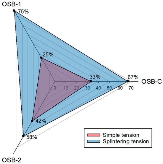 On the other hand, after analyzing the modes of failure (Figure 5), only two types were observed: simple tension and splintering tension, with the predominant mode being splintering tension. This result was expected due to the composition of the OSB panels (flake distribution).