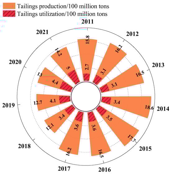 It is evident that contemporary mining and beneficiation operations worldwide, encompassing both developing and developed countries, result in the mass production of tailings on an annual basis [1,2,3]. In China, for instance, statistical data [4] reveal that since 2011, the utilization of clearly measured tailings has fallen short of 36% (Figure 1). Lead–zinc tailings, a specific type of tailings, are the residual solid waste that is left over after lead–zinc ore has undergone the processes of crushing and flotation. In comparison with other tailings, these tailings frequently contain heavy metals such as lead and zinc. The disposal of lead–zinc tailings consumes a significant amount of land resources and poses a serious threat to the local environment, particularly soil, groundwater, and surrounding ecosystems [5,6]. Consequently, there is an imperative for rigorous research to explore the diversified recycling and utilization of lead–zinc tailings.