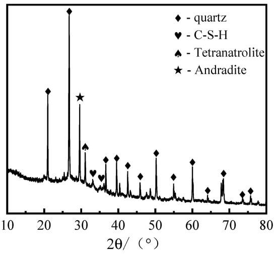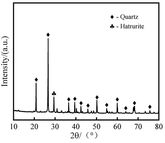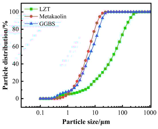 GFC was prepared using lead–zinc tailings (LZTs), metakaolin (MK), and ground granulated blast furnace slag (GGBS) as aluminosilicate precursors. The LZT utilized in the experiment was obtained from a tailing pond situated at Shuikoushan, Hengyang City, China. The chemical composition of the LZT is characterized by a high SiO2 content of 72.47% and a CaO content of 10.74%. The MK used in the experiment was supplied by Hongle Mining Products Co., Ltd., located in Gongyi City, China, and was employed as an aluminum supplement to adjust the silicon-to-aluminum ratio of the system. The GGBS was obtained from Longze Water Purification Materials Co., Ltd. in Gongyi City, China, and has a CaO content of 34.00%. It is utilized as a calcium supplement to regulate the setting time of the geopolymer. The X-ray fluorescence (XRF) analysis of three types of geopolymer precursor materials is shown in Table 2. The phase composition of the LZT was determined through a combination of X-ray diffraction (XRD) analysis and the utilization of Jade 9.0 software. The results are displayed in Figure 2, which indicates that the primary mineral phases of LZT are quartz and hatrurite. Additionally, a laser particle size analyzer was utilized to assess the size distribution of the three raw materials, as depicted in Figure 3.