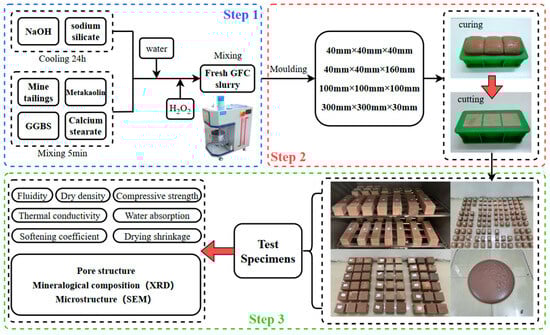 Upon reaching the initial setting time, the molded body ceases expansion. Cover with plastic wrap to prevent moisture loss. Subsequently, the sample should be placed at room temperature to facilitate the process of further curing. After 24 h, demold the sample and cut off the expanded portion of the mold. Test specimens should be stored in a curing chamber maintaining a temperature of 20 ± 2 °C and ≥90% relative humidity. Designated curing durations must be completed prior to testing. A flowchart of the methodology route used in this work is illustrated in Figure 4.