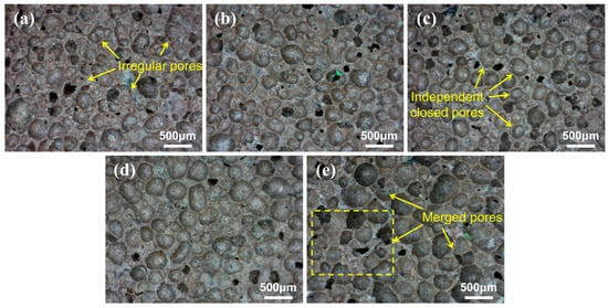 Microscopic images of pore structures were captured at a fixed focal length, with labels (a–e) denoting representative cross-sectional images of the pore structure of GFC at varying LZT contents: (a) 30%; (b) 40%; (c) 50%; (d) 60%; (e) 70%.