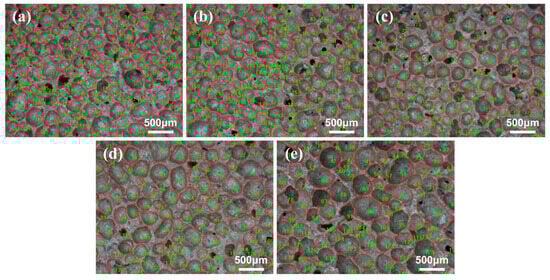 As demonstrated in Figure 5, optical microscope images of the pore structure of GFC under varying LZT content are presented. The pores were identified and counted using Image-Pro-Plus software, as demonstrated in Figure 6. It has been observed that at a tailings content of 30%, the pore shapes are predominantly irregular polygons, with dense small pores distributed between the larger pores, and the distribution of pores with different diameters is uneven. In the case of LZTs with contents of 40% and 50%, the predominant pore morphology is that of closed pores. The pore shapes become more regular and spherical in shape, and the pore distribution becomes relatively uniform. In addition, the spacing between pores is relatively consistent, and there are no discernible areas of local pore density or sparsity. However, as the tailings content is increased, the pore diameter undergoes a significant increase, particularly at 70% tailings content, where the uniformity of pore distribution deteriorates and notable bonding phenomena occur between pores, leading to an increase in merged pores and interconnected pores formed by the combination of small pores.