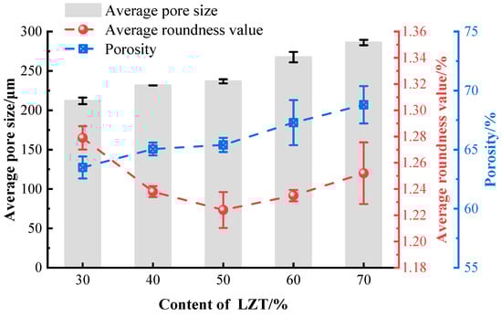 The data regarding the pore structure for each group consists of pores measured from three distinct cross-sections. The pore structure parameters of GFC under varying LZT content are illustrated in Figure 7. The study indicates that an increase in LZT content leads to an increase in porosity, with the average pore diameter increasing from 212.02 μm to 286.09 μm. This phenomenon is attributed to the enhanced flowability of GFC as LZT content rises, which decreases the relative viscosity of the slurry. This reduction in viscosity enables bubbles to surmount viscous resistance and expand more readily, leading to the formation of larger, independent pores [28]. Furthermore, the surface of tailings particles is characterized by a relative roughness, which, under the influence of friction, can lead to the rupture or merging of some bubbles into larger interconnected pores. This process results in an augmentation of both the average pore diameter and porosity.