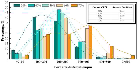 Figure 8 also shows the skewness coefficients of the pore size distribution under different LZT dosages. It is evident that all skewness coefficients are positive, indicating that the pore size distribution of GFC exhibits a positively skewed distribution. Furthermore, the tailings content exerts a substantial influence on the degree of skewness in the pore size distribution. At a 40% LZT content, the skewness coefficient is minimal, and the pore size distribution exhibits higher symmetry and is close to a normal distribution. This indicates that the pore size distribution exhibits optimal uniformity at a 40% LZT content. In general, high-performance foam concrete is characterized by a relatively uniform pore size distribution, with no significant presence of excessively large or small pores [44,45].