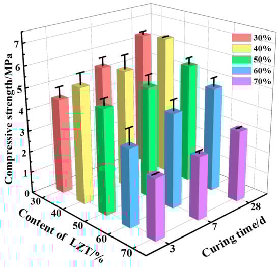 As displayed in Figure 10, the compressive strength of GFC demonstrates an initial increase and subsequent decrease with increasing LZT content. The findings indicate that, at a LZT content of 40%, the compressive strength of GFC samples at all ages achieves its maximum values, with the corresponding measurements recorded at 5.39 MPa, 5.53 MPa, and 6.50 MPa, respectively. It is noteworthy that the compressive strength of all samples at three days reached 70% or more of the 28-day strength. This is primarily attributed to the higher CaO content in the GGBS and LZT components. In comparison with Si-O and Al-O bonds, Ca-O bonds demonstrate a higher propensity for breakage [46]. The reaction of the precipitated Ca2+ with the silicoaluminate monomers is catalyzed by alkali activators, resulting in the formation of C–(A)–S–H gel. The spatial network structure, which is formed rapidly, significantly enhances the early strength of GFC.