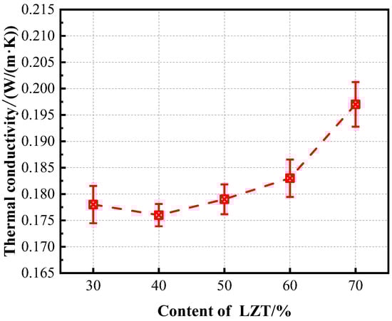 Thermal conductivity is the primary indicator of the thermal insulation performance of foam concrete. Foam concrete with low thermal conductivity has the potential to markedly reduce the energy consumption of building operations. As demonstrated in Figure 11, the thermal conductivity initially decreases and subsequently increases with an increase in LZT content. It is noteworthy that at 40% LZT content, the thermal conductivity of GFC is the lowest, measuring at 0.176 W/(m·K). In general, the thermal conductivity of foam concrete is associated with its pore structure and dry density. At a tailings’ content of 40%, GFC exhibits the lowest dry density, with its pores predominantly comprising closed, nearly spherical gas pores. The presence of closed pores functions as minute insulating units, impeding heat conduction through continuous pathways and thereby effectively hindering rapid heat transfer within the material [19,48]. Furthermore, pores with smaller average roundness values possess relatively regular and stable geometric shapes, which renders them less susceptible to local heat bridges or heat short circuits during heat conduction [38]. As a result, gas convection heat transfer is suppressed, thereby reducing localized heat concentrations. However, as the LZT content increases, the higher dry density of GFC enhances thermal conductivity efficiency. Additionally, the numerous interconnected pores within the material form pathways for heat transfer, allowing heat to flow without being obstructed by numerous closed thermal insulation units. This results in a significant increase in the thermal conductivity coefficient.
