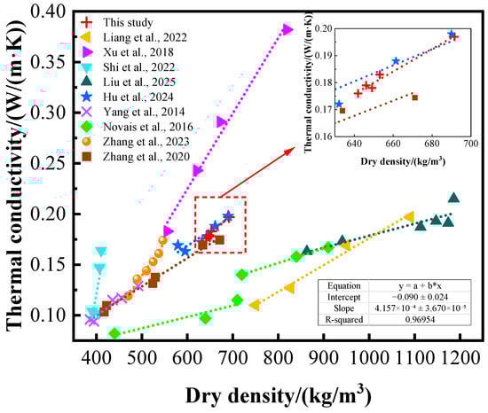 Relationship between density and thermal conductivity (comparison between this study and the relevant literature). In which, Liang et al. [20], Xu et al. [23], Shi et al. [26], Liu et al. [43], Hu et al. [45], Yang et al. [49], Novais et al. [50], Zhang et al. [51], Zhang et al. [52].