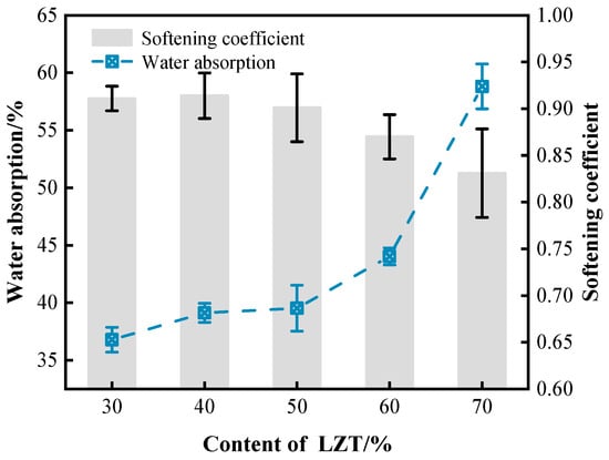 As illustrated in Figure 13, an augmentation in LZT content gives rise to contrasting trends in the water absorption rate and softening coefficient of GFC. Specifically, the water absorption rate exhibited an increase that was correlated with rising LZT content, with the rate showing marked acceleration. The water absorption rate of foam concrete is indicative of the interconnected/open pores within the material [19,53]. When LZT content ranges between 30% and 50%, pores in GFC material are predominantly closed pores, thereby effectively impeding pathways for external water penetration. However, the presence of excessive LZT content has been demonstrated to induce degradation of the pore structure, resulting in an augmented number of interconnected and large pores within the GFC. This change subsequently leads to a substantial augmentation in the rate of water absorption.
