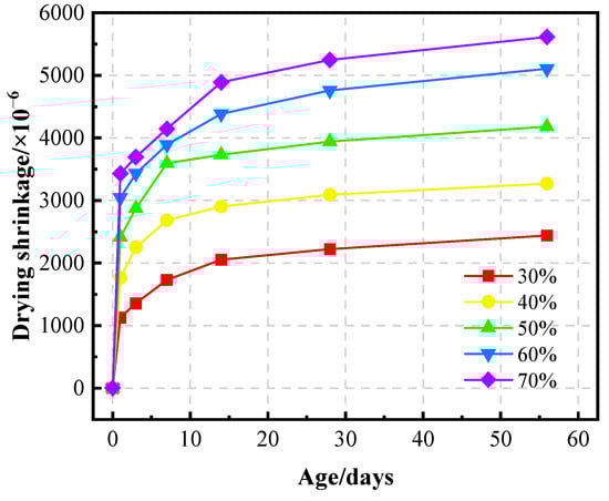Figure 14 displays the drying shrinkage of GFC as a function of LZT content. During the initial phases of specimen curing, the drying shrinkage of GFC undergoes rapid development. This phenomenon can be attributed to the predominant occurrence of dissolution and condensation reactions of the silicon-aluminum precursor raw materials in an alkaline environment during the initial stages of the process. This results in elevated water consumption, attributable to the progression of geopolymerization reactions [56,57]. The phenomenon of drying shrinkage principally entails the contraction of gel pores and capillaries, culminating in a decline in the water saturation of the internal capillaries as moisture is lost to the external environment. As the LZT content increased from 30% to 70%, the drying shrinkage of GFC persisted in its escalation, with the 56-day drying shrinkage rate rising from 2439 × 10−6 to 5613 × 10−6. On one hand, the larger average particle size of LZT relative to MK results in a smaller specific surface area, which leads to a reduced capacity for water adsorption. Consequently, more water remains in the system, awaiting evaporation and loss. On the other hand, an excess of LZT content has been shown to increase the number of interconnected pores within the GFC, thereby providing direct pathways for moisture migration. Additionally, an increase in LZT content results in a reduction in GFC strength, consequently diminishing its capacity to resist shrinkage stress. In comparison with the findings of other studies [26,58], the drying shrinkage of the specimens in this study was marginally higher. However, certain scholars have achieved reduced drying shrinkage or enhanced crack resistance by incorporating fibers such as polypropylene [59], polyvinyl alcohol [29], and basalt fibers [60] into the material. Therefore, future studies can optimize the mix ratio of this experiment by incorporating fibers to reduce the drying shrinkage rate of GFC.