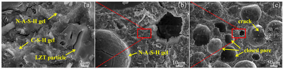 Figure 16 presents scanning electron microscopy (SEM) images of GFC. In Figure 16a, as the geopolymerization and hydration reactions progressed, a structurally dense gel phase was formed, primarily composed of amorphous sodium aluminum silicate gel (N–A–S–H gel) and flake-like C–S–H gel. The silica–alumina precursor is dissolved under the action of an alkaline activator. The active silica and alumina tetrahedra undergo geopolymerization, resulting in the formation of N–A–S–H gel. The formation of C–S–H gel is a consequence of hydration reactions between the silica tetrahedra within the system and CaO from LZT and GGBS. Furthermore, the figure indicates the presence of unreacted tailings particles, which correspond to the quartz phase diffraction peaks observed in the XRD spectrum. The micro-aggregate filling effect of LZT is responsible for the formation of the mineral skeleton of the GFC. And the gelatinous products exhibit a high degree of adhesion to the tailing particles [62], thereby forming a dense and stable microstructure. As shown in Figure 16b, amorphous N–A–S–H gel is observed to extensively coat the pore surfaces, resembling a thick protective layer. This process has been shown to enhance the stability and strength of the pore structure. Figure 16c displays that the pores in GFC predominantly manifest as closed pores, exhibiting shapes that approximate regular spherical forms. The presence of microcracks on the pore surfaces was observed, primarily due to damage incurred during the sample preparation process for SEM testing. Additionally, the presence of microcracks may be attributed to insufficient bonding or encapsulation of certain tailings particles by the gel products [43,63]. This phenomenon results in the initiation and subsequent expansion of the microcracks.