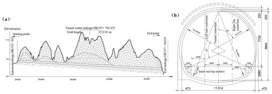 Detailed drawing of tunnel structure: (a) tunnel longitudinal section drawing; (b) tunnel lining drawing.
