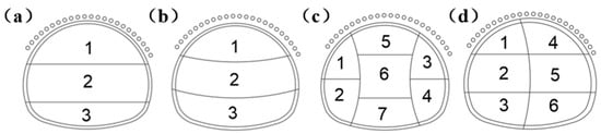 Model diagrams of tunnel excavation under different construction methods: (a) the three-step method; (b) the three-step temporary inverted arch method; (c) the double-side wall pilot tunnel method; (d) CD method.