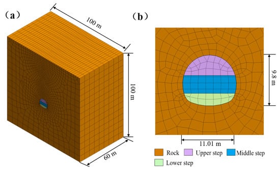 - The surrounding rock was modeled using the Mohr–Coulomb constitutive model, while the primary lining, rock bolts, temporary supports, and advanced small pipe grouting were represented by linear elastic models.